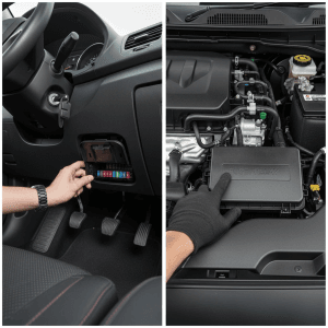 جعبه فیوز داخل کابین: معمولاً زیر داشبورد سمت راننده (کنار پدالها) یا در کنار درب راننده قرار دارد. این جعبه مسئول برق ادوات داخلی مانند ضبط، فندک، چراغ سقفی و سیستم تهویه است.